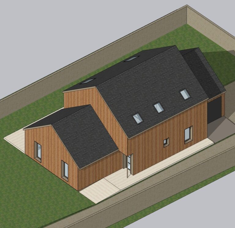 Nous concevons ensuite une première proposition en 3D, présentant le volume, la disposition des espaces et les matériaux envisagés pour l’enveloppe de la maison. Ce visuel permet de vous projeter facilement et de valider l’esprit général de votre future maison.